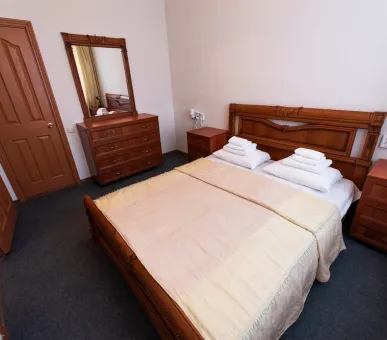 Санаторий раскинулся на берегу р. Демы в окружении смешанного леса. Территорию площадью 17 га украшают ухоженные газоны и прогулочные аллеи, цветочные вазоны, точеные уличные фонари и скамейки. Единый жилой корпус включает в себя 7 зданий разной этажности (3-6 этажей), соединенных между собой: корпуса 2,4,6 расположены параллельно в одну линию, 1,3,5,7 – перпендикулярно им. К корпусам 6,7 примыкает административное здание со столовой и клубом. Рядом стоит водолечебница, оборудованная подземным переходом. Неподалеку – хозпостройки и конюшня. Для размещения предлагается большой выбор номеров разных категорий комфортности. Не зависимо от уровня, все они обеспечены необходимым набором мебели и удобств, имеют собственный санузел, холодильник и ТВ.