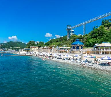 У отеля собственный мелкогалечный пляж, расположенный в 250 метрах от жилого корпуса. На пляж гости могут спуститься на панорамном лифте, а могут пройти по терренкуру. На побережье пологий вход в море, что отлично подходит для семей с маленькими детьми, работает кафе, есть шезлонги и пляжные зонтики, для маленьких детей организована специальная зона для купания, постоянно проходят анимационные и спортивные программы.
